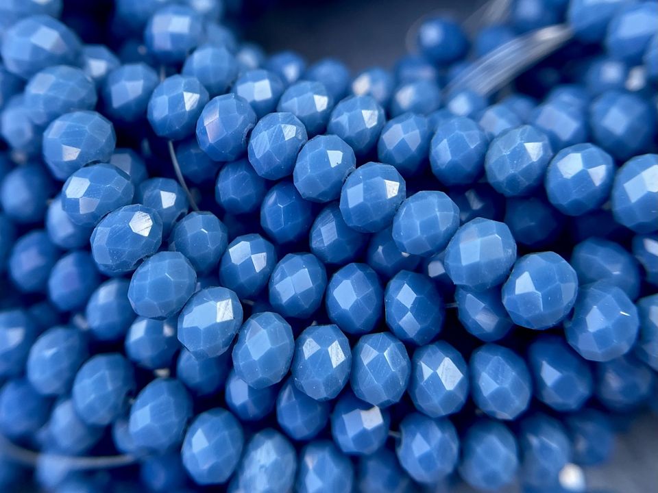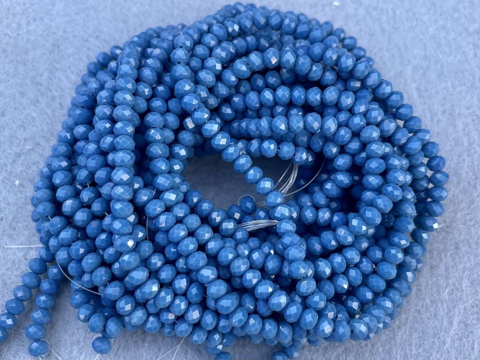 Кришталеві намистини, грановані. Розмір: 4*4,5мм, отвір: 1мм. Форма: рондель, сфера. У нитці: 143+-5шт. Ціна за 1 нитку. Колір синій.
