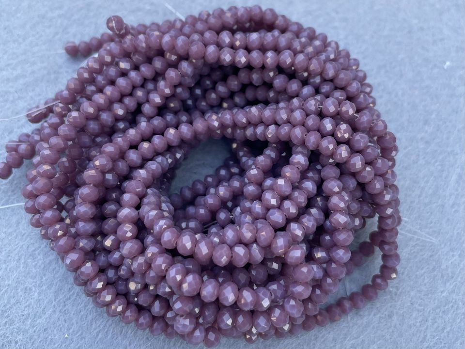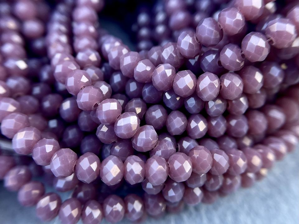 Кришталеві намистини, грановані. Розмір: 4*4,5мм, отвір: 1мм. Форма: рондель, сфера. У нитці: 143+-5шт. Ціна за 1 нитку. Колір фіолетовий.
