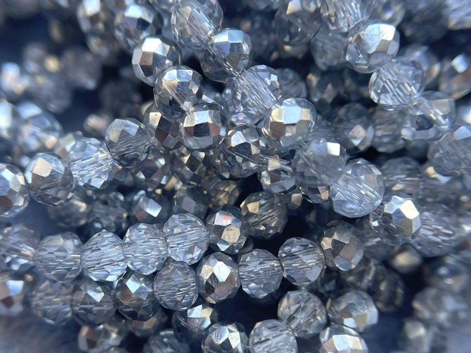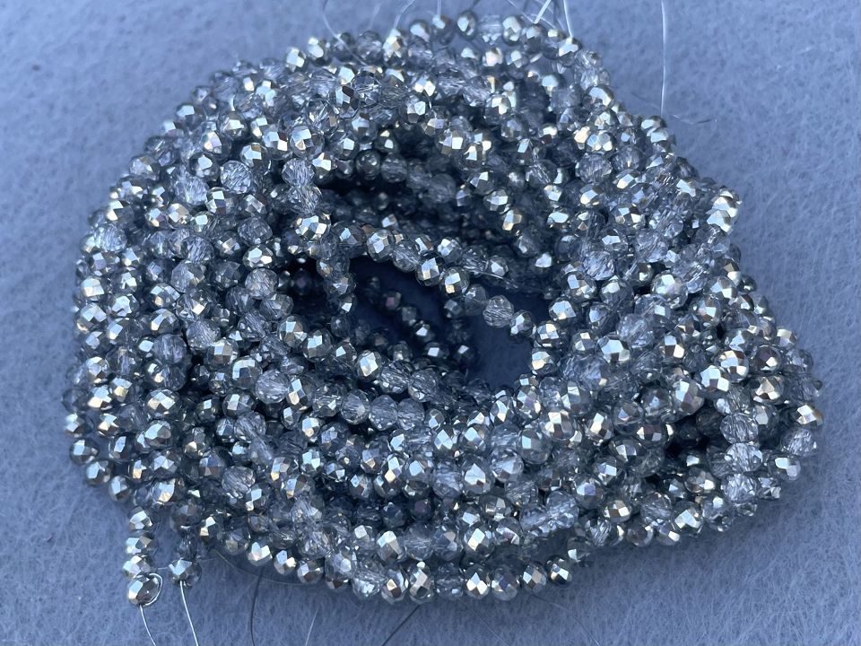 Кришталеві намистини, грановані. Розмір: 4*4,5мм, отвір: 1мм. Форма: рондель, сфера. У нитці: 143+-5шт. Ціна за 1 нитку. Колір-прозорий із сріблом.