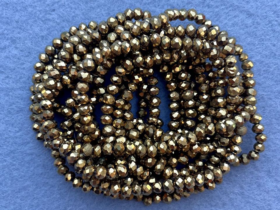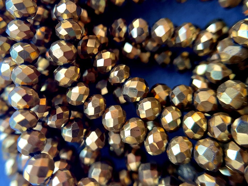 Кришталеві намистини, грановані. Розмір: 4*4,5мм, отвір: 1мм. Форма: рондель, сфера. У нитці: 143+-5шт. Ціна за 1 нитку. Колір золото.