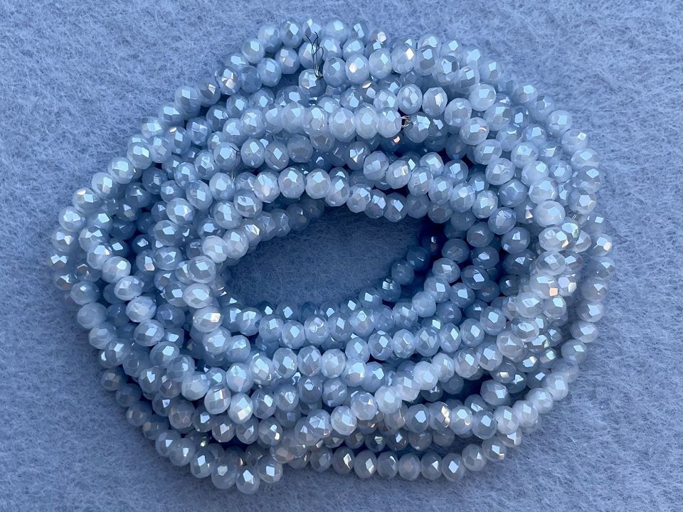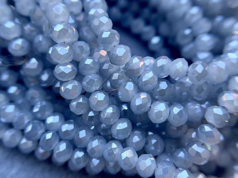 Кришталеві намистини, грановані. Розмір: 4*4,5мм, отвір: 1мм. Форма: рондель, сфера. У нитці: 143+-5шт. Ціна за 1 нитку. Сірий колір.