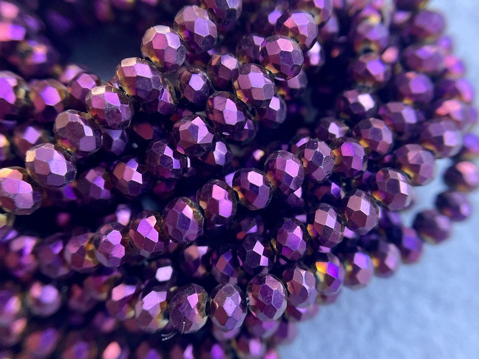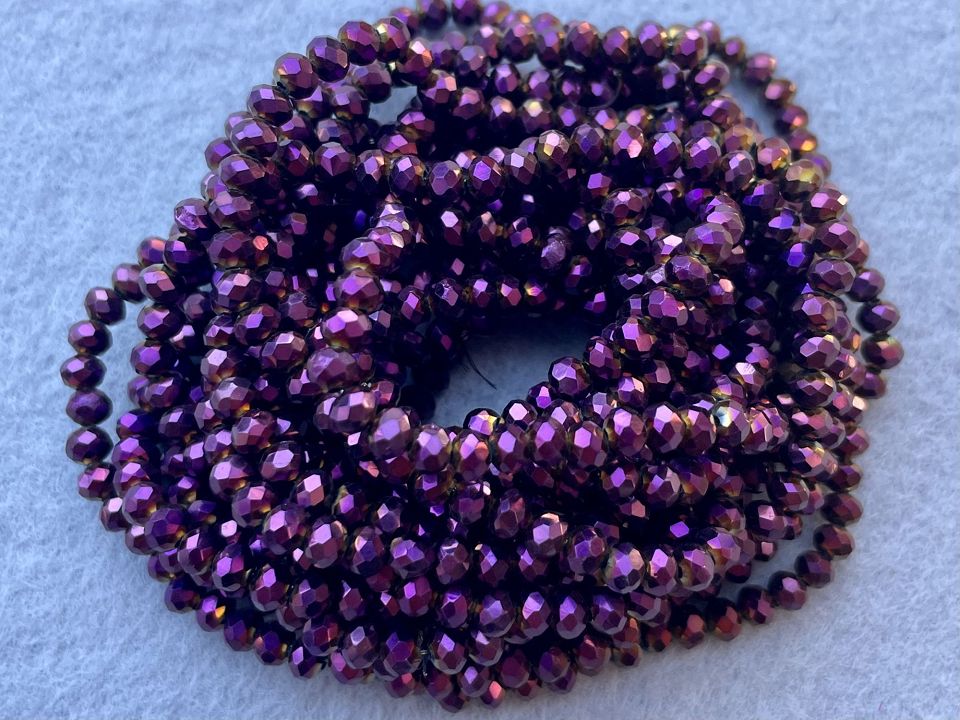Кришталеві намистини, грановані. Розмір: 4*4,5мм, отвір: 1мм. Форма: рондель, сфера. У нитці: 143+-5шт. Ціна за 1 нитку. Колір фіолетовий.