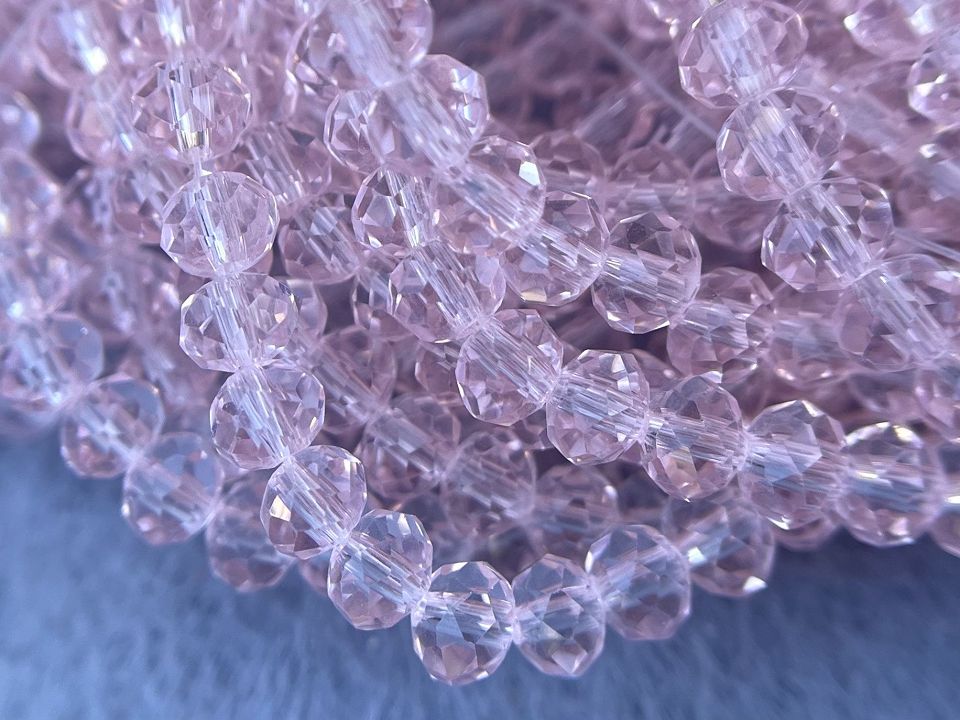 Кришталеві намистини, грановані. Розмір: 4*4,5мм, отвір: 1мм. Форма: рондель, сфера. У нитці: 143+-5шт. Ціна за 1 нитку. Колір-світло рожевий.