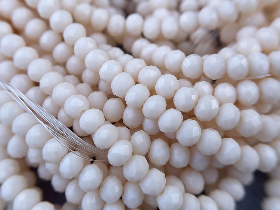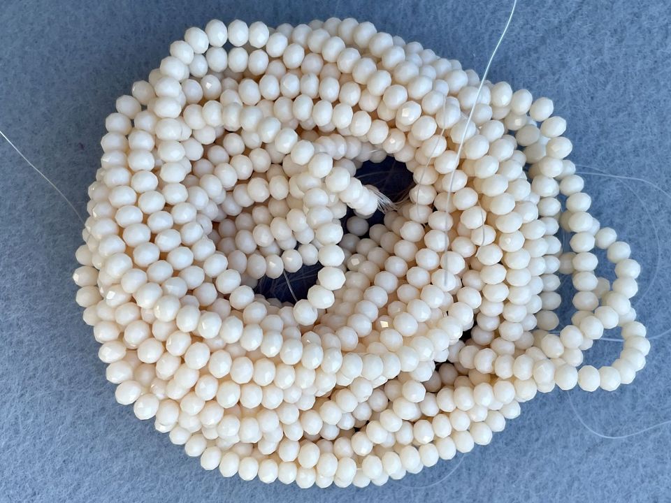 Кришталеві намистини, грановані. Розмір: 4*4,5мм, отвір: 1мм. Форма: рондель, сфера. У нитці: 143+-5шт. Ціна за 1 нитку. Колір бежевий.