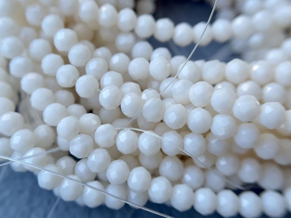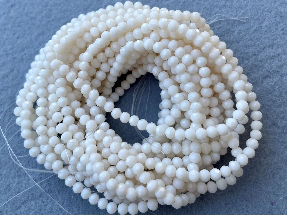 Кришталеві намистини, грановані. Розмір: 4*4,5мм, отвір: 1мм. Форма: рондель, сфера. У нитці: 143+-5шт. Ціна за 1 нитку. Колір-молочний.