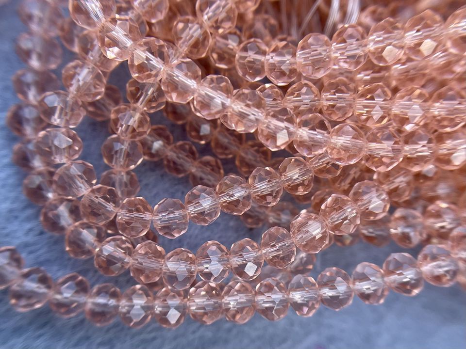 Кришталеві намистини, грановані. Розмір: 4*4,5мм, отвір: 1мм. Форма: рондель, сфера. У нитці: 143+-5шт. Ціна за 1 нитку. Колір-персиковий.