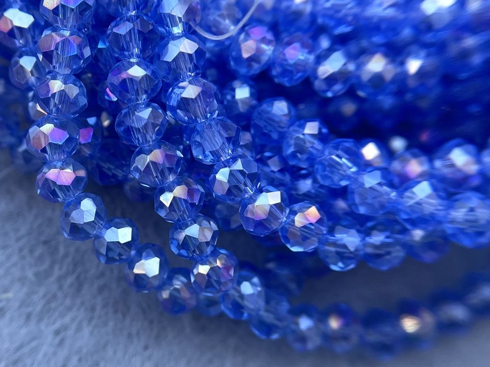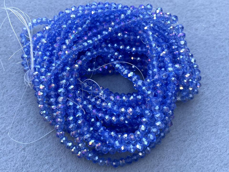 Кришталеві намистини, грановані. Розмір: 4*4,5мм, отвір: 1мм. Форма: рондель, сфера. У нитці: 143+-5шт. Ціна за 1 нитку. Колір-небесний з переливом.
