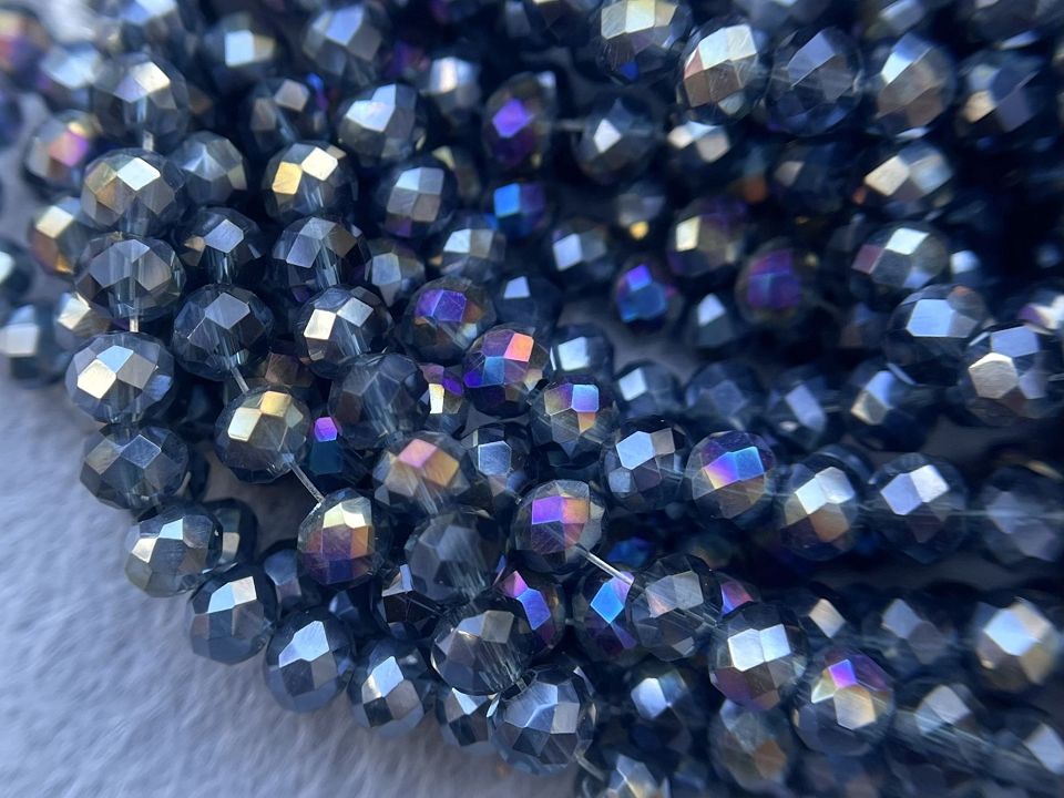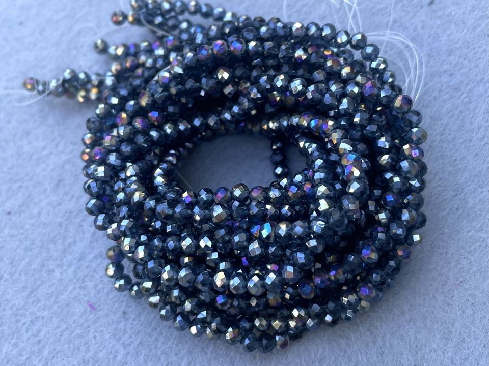 Кришталеві намистини, грановані. Розмір: 4*4,5мм, отвір: 1мм. Форма: рондель, сфера. У нитці: 143+-5шт. Ціна за 1 нитку. Колір темно синій з переливом.