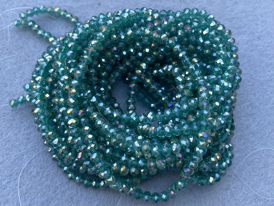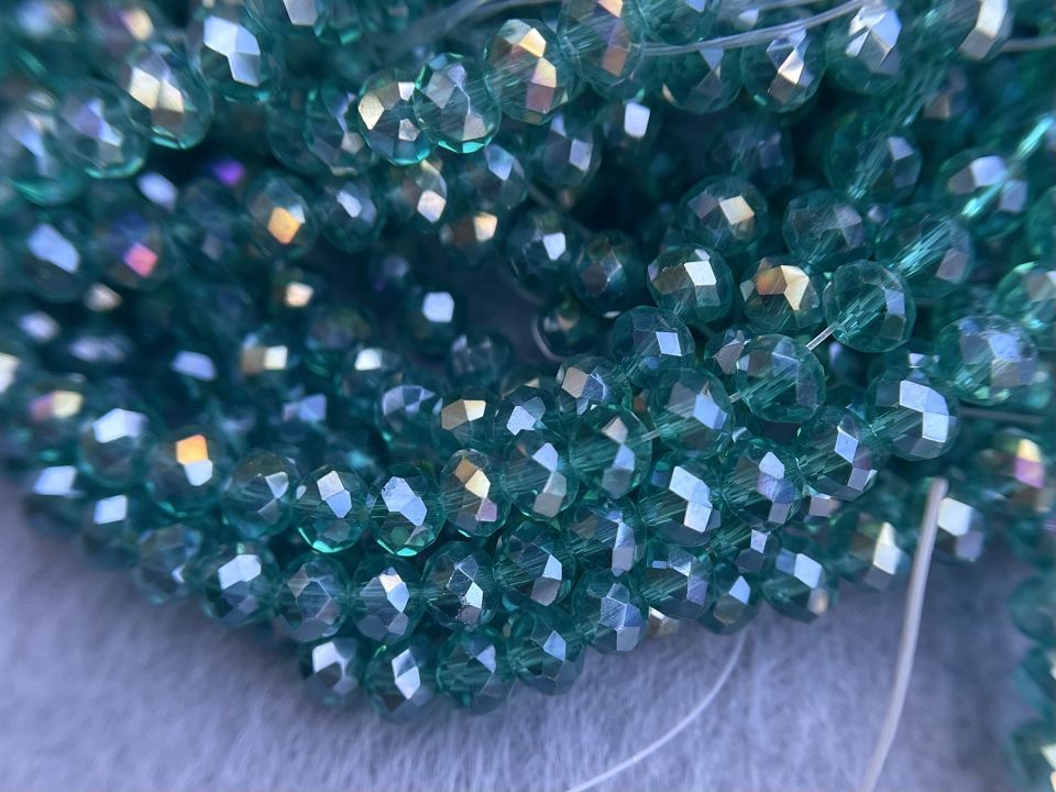 Кришталеві намистини, грановані. Розмір: 4*4,5мм, отвір: 1мм. Форма: рондель, сфера. У нитці: 143+-5шт. Ціна за 1 нитку. Колір-морська хвиля з переливом.