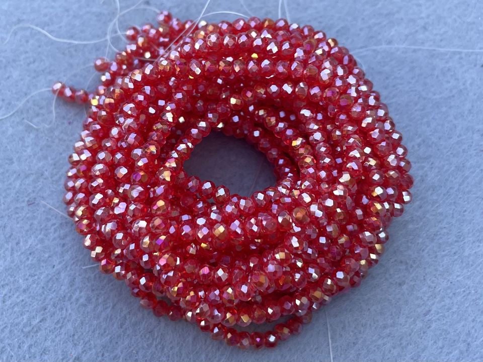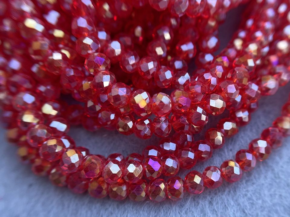 Кришталеві намистини, грановані. Розмір: 4*4,5мм, отвір: 1мм. Форма: рондель, сфера. У нитці: 143+-5шт. Ціна за 1 нитку. Колір-червоний з переливом.