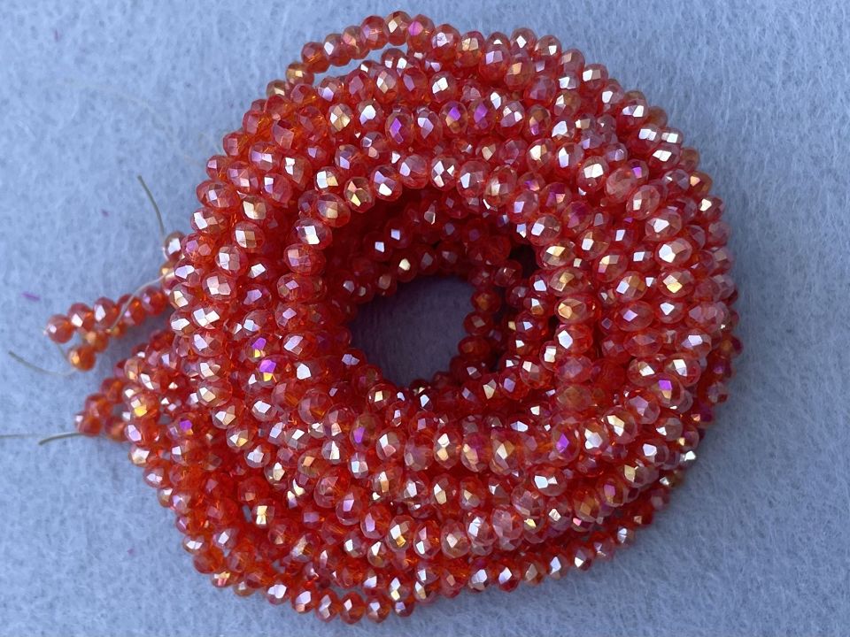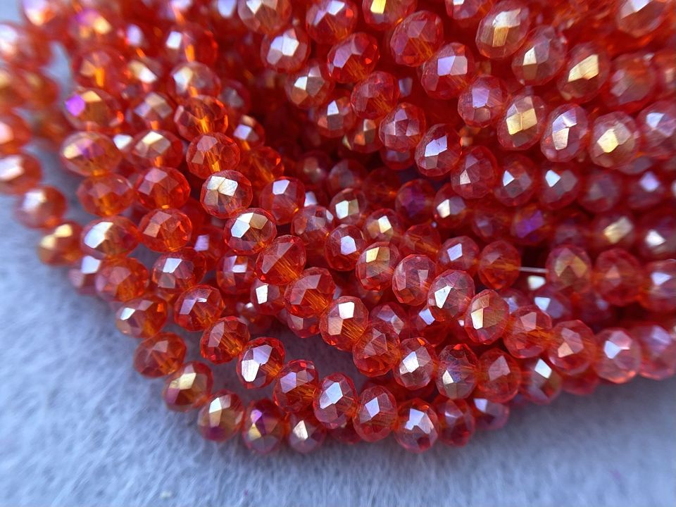 Кришталеві намистини, грановані. Розмір: 4*4,5мм, отвір: 1мм. Форма: рондель, сфера. У нитці: 143+-5шт. Ціна за 1 нитку. Колір помаранчевий з переливом.