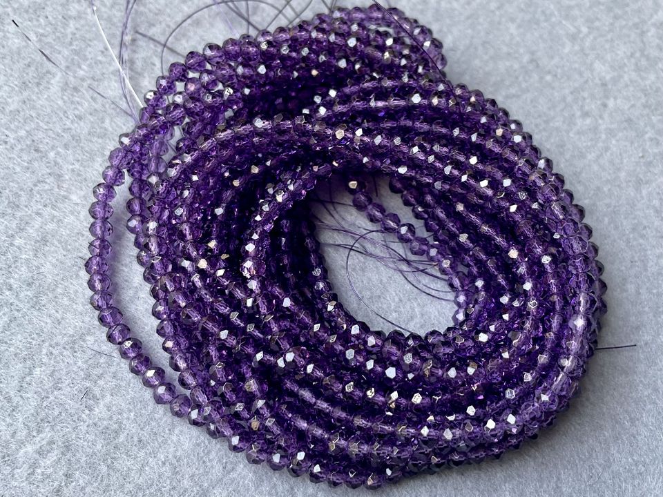 Кришталеві намистини, грановані. Розмір: 4*4,5мм, отвір: 1мм. Форма: рондель, сфера. У нитці: 120+-5шт. Ціна за 1 нитку. Колір фіолетовий .