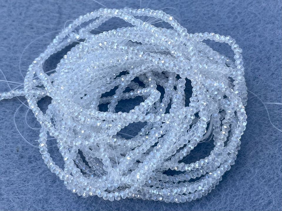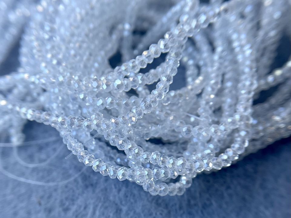 Кришталеві намистини, грановані. Розмір: 1*2мм, отвір: 0,7 мм. Форма: рондель, сфера. У нитці: 195+-3шт. Ціна за 1 нитку.