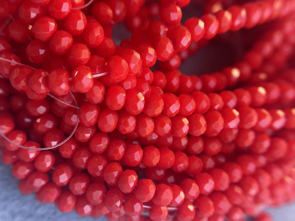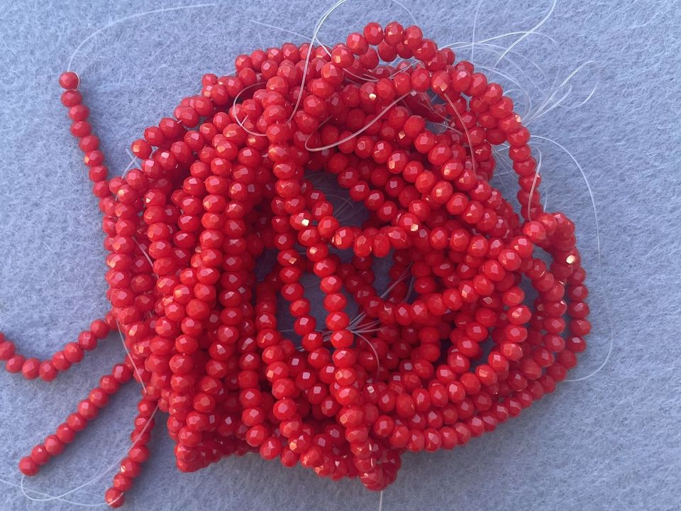 Кришталеві намистини, грановані. Розмір: 3*3,5мм, отвір: 1 мм. Форма: рондель, сфера. У нитці: 145+-5шт. Ціна за 1 нитку. Колір-світло червоний.