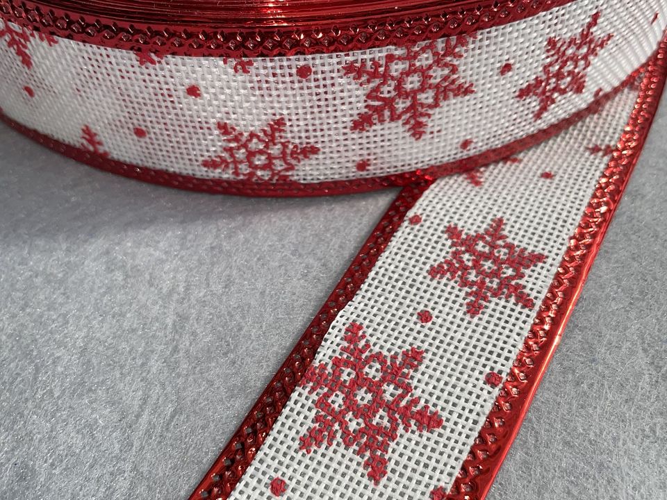 Декоративна новорічна стрічка з дротовим краєм -Добре тримає форму. Ширина-3,8см; в Бабині-45метров. Використовується для оформлення подарунків, композицій, виготовлення ялинкових іграшок та декору, при виготовленні новорічних бантів на ялинку, новорічного декору.