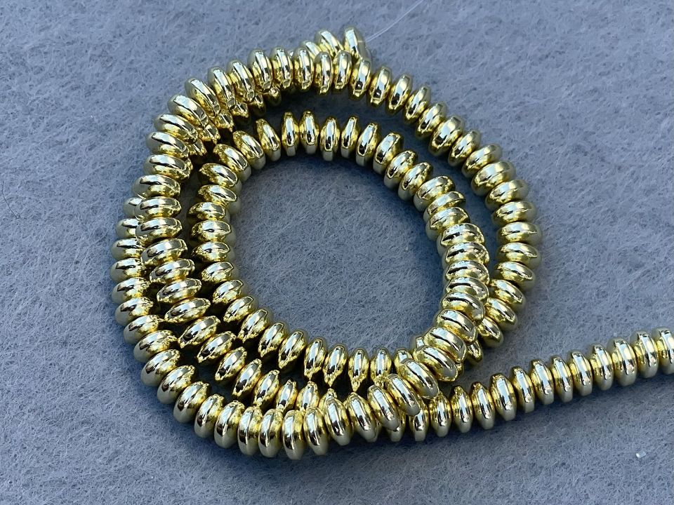 Гематит-натуральний, гладкий. Розмір намистини: 6*3 мм. Кількість намистин на нитці: 140 (+-2шт). Отвір: 1мм. Колір – світле золото. Ціна за нитку.
