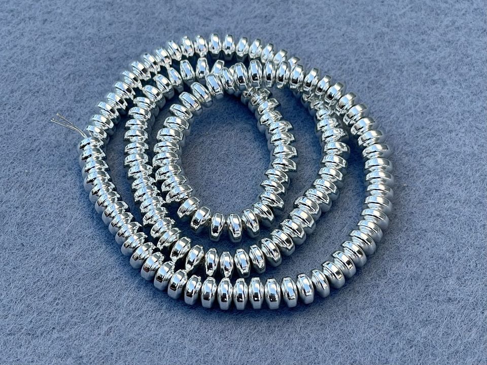 Гематит-натуральний, гладкий. Розмір намистини: 6*3 мм. Кількість намистин на нитці: 140 (+-2шт). Отвір: 1мм. Колір – срібло. Ціна за нитку.