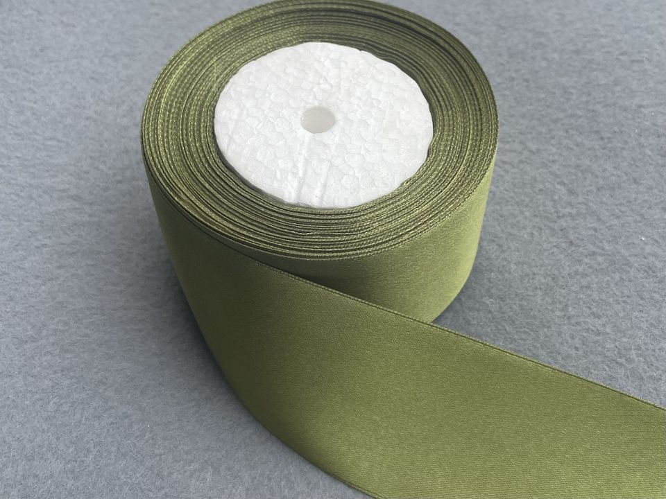 Стрічка атласна-ширина 5 см. У мотку ~23 метри. Колір-оливковий. Застосовують для прикраси, обробки одягу, вишивання стрічками, плетіння стрічками і т.д. Ціна вказана за 1 моток. Виробництво – Китай.
