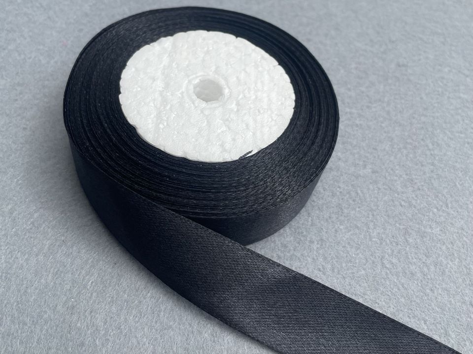 Стрічка атласна-ширина 2.5 см. У мотку ~23 метри. Колір-чорний. Застосовують для прикраси, оздоблення одягу, вишивання стрічками, плетіння стрічками тощо. Ціна вказана за 1 моток. Виробництво – Китай.