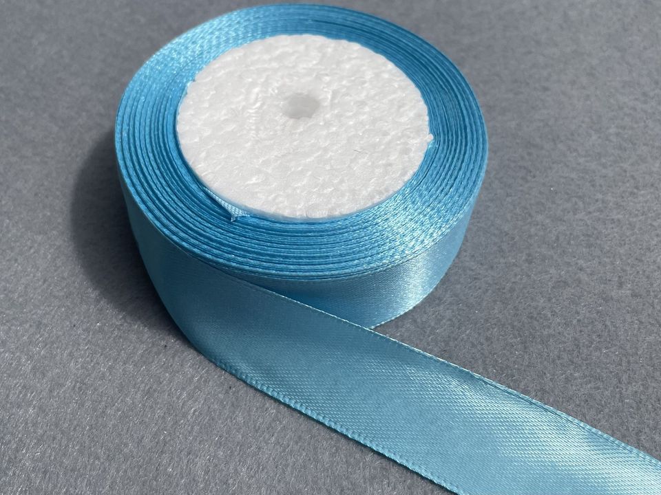 Стрічка атласна-ширина 2.5 см. У мотку ~23 метри. Колір-блакитний. Застосовують для прикраси, оздоблення одягу, вишивання стрічками, плетіння стрічками тощо. Ціна вказана за 1 моток. Виробництво – Китай.