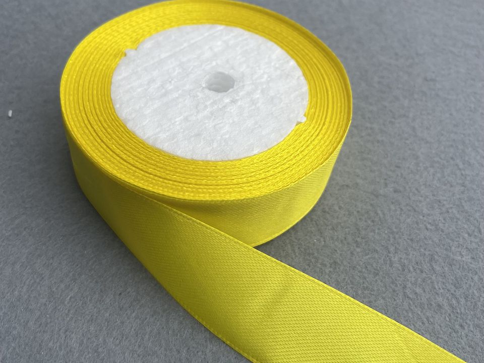 Стрічка атласна-ширина 2.5 см. У мотку ~23 метри. Колір-жовтий. Застосовують для прикраси, оздоблення одягу, вишивання стрічками, плетіння стрічками тощо. Ціна вказана за 1 моток. Виробництво – Китай.