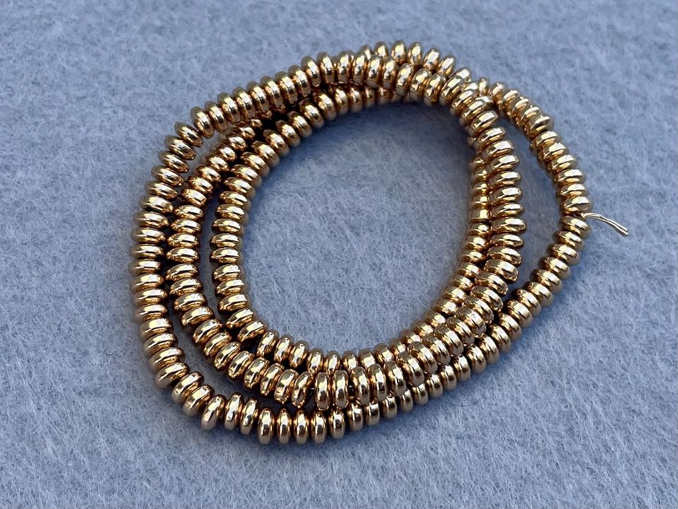 Гематит-натуральний, гладкий. Розмір намистини: 4*2 мм. Кількість намистин на нитці: 2010 (+-2шт). Отвір: 1мм. Колір - рожеве золото. Ціна за нитку.