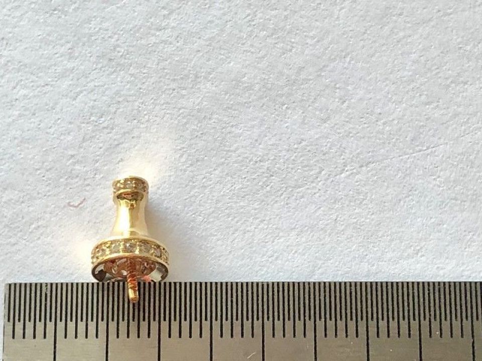 Шапочки-ковпачки інкрустовані кубічним цирконієм, для виготовлення сережок. покриття родій Розмір: висота-10 мм, діаметр 8мм, зі штирем для намистини Колір-золото, ціна за 1 шт