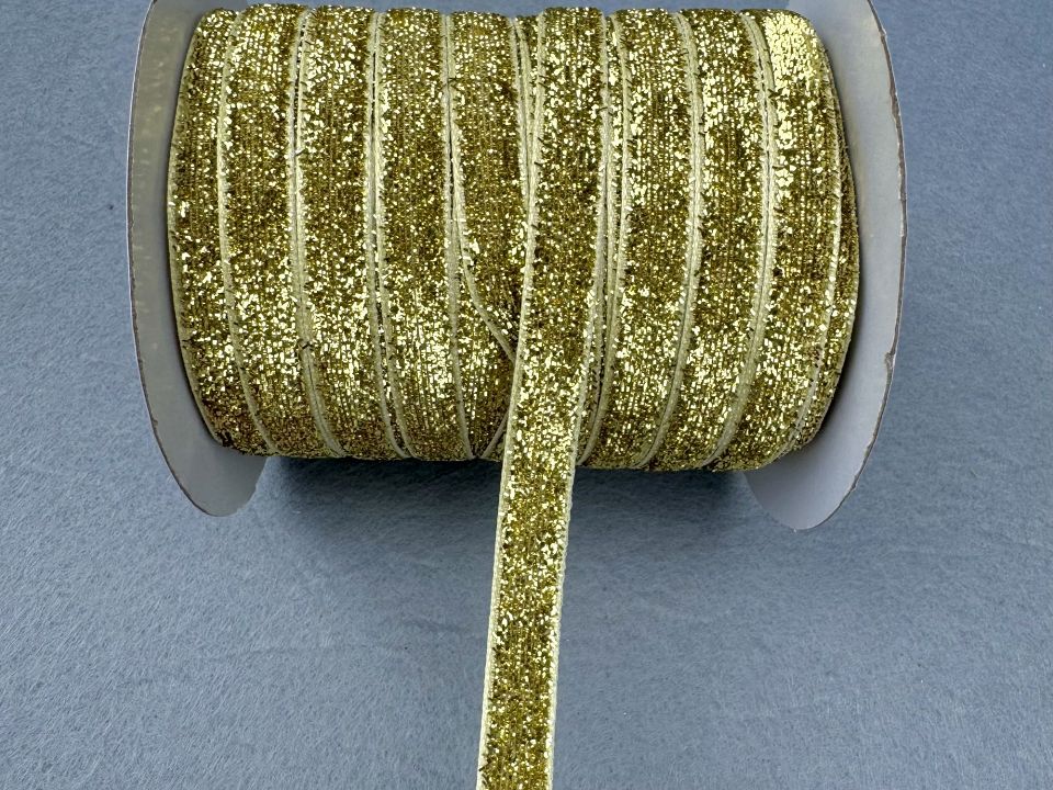 Стрічка велюрова люрексова, ширина 1 см. У мотку ~50 метрів. Колір-світле золото. Застосовують для прикраси, обробки одягу, вишивання стрічками, плетіння стрічками і т.д. Ціна вказана за 1 бабину. Виробництво – Китай.