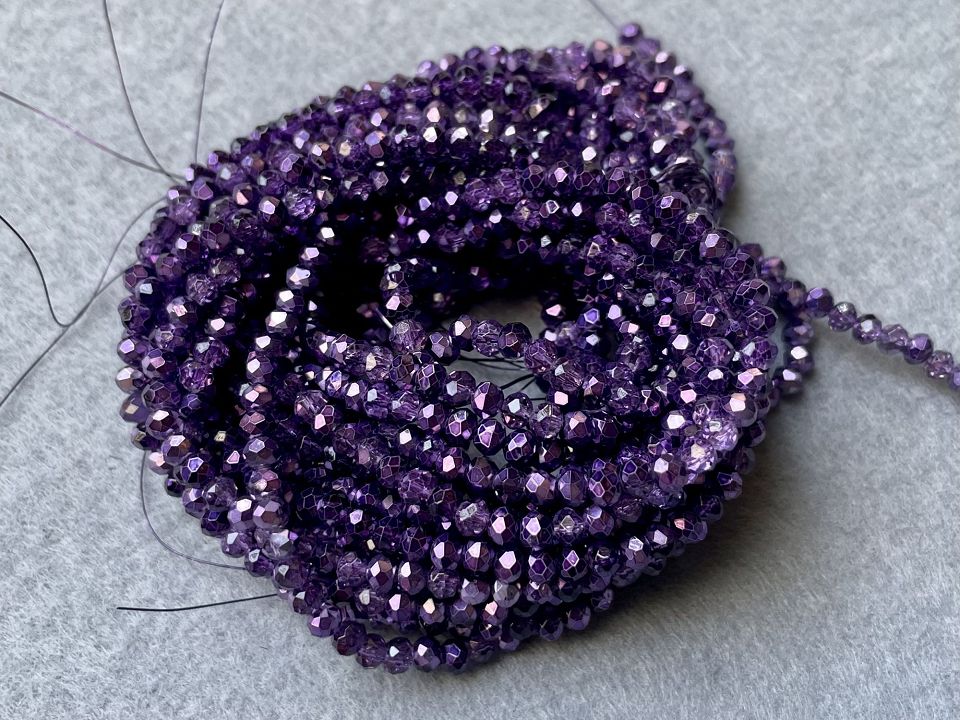 Кришталеві намистини, грановані. Розмір: 4*4,5мм, отвір: 1мм. Форма: рондель, сфера. У нитці: 120+-5шт. Ціна за 1 нитку. Колір фіолетовий .