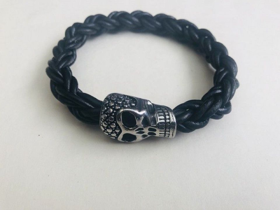 Плетений шкіряний браслет зі сталевою застібкою і декоративними фрагментами. Розмір в наявності: 22см