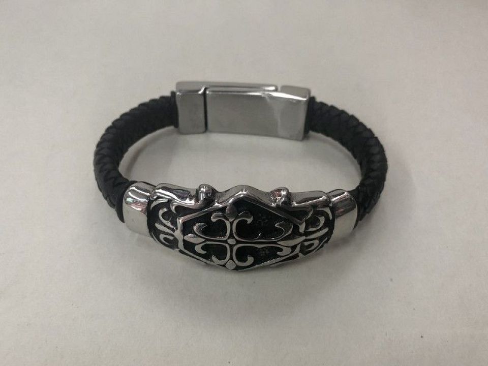 Плетений шкіряний браслет зі сталевою застібкою і декоративними фрагментами. Розмір в наявності: 19 см