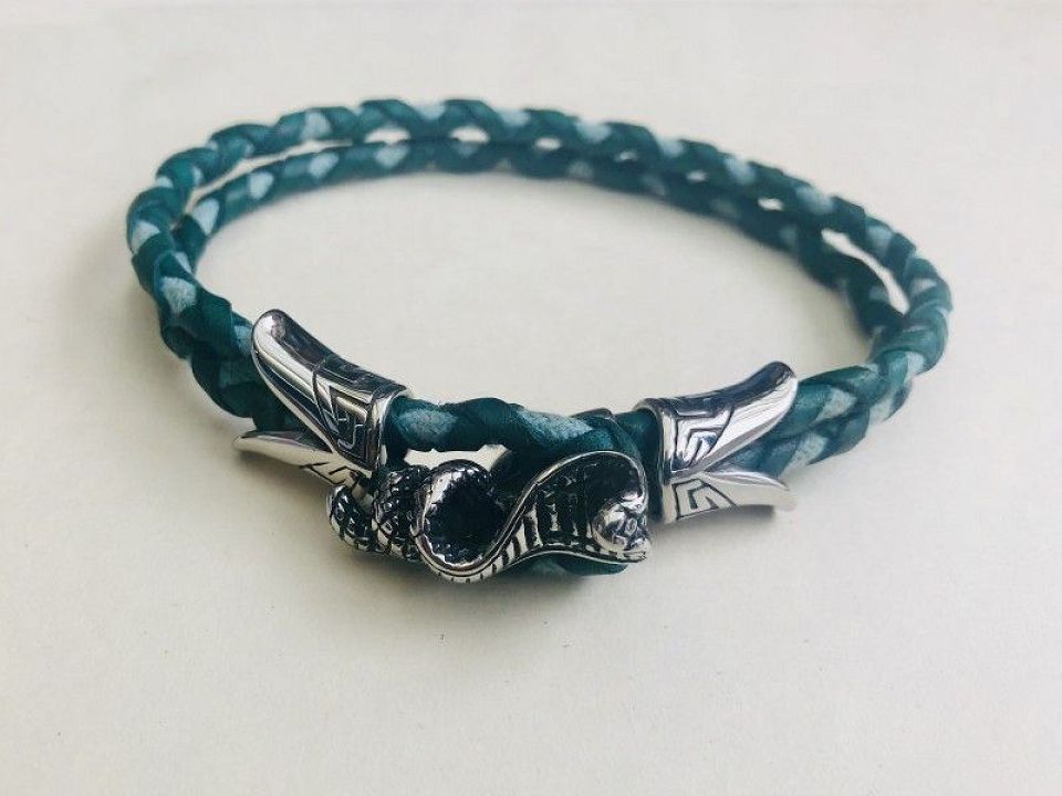 Плетений шкіряний браслет зі сталевою застібкою і декоративними фрагментами. Розмір в наявності: 23см