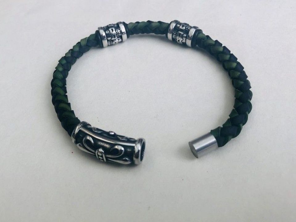 Плетений шкіряний браслет зі сталевою застібкою і декоративними фрагментами. Розмір в наявності: 21см