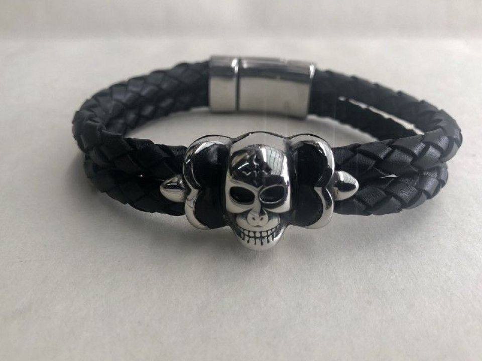 Плетений шкіряний браслет зі сталевою застібкою і декоративними фрагментами. Розмір в наявності: 20 см