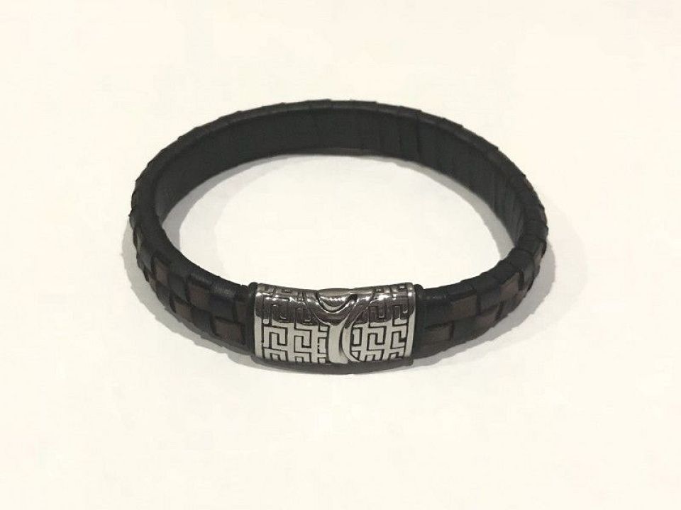 Плетений шкіряний браслет зі сталевою застібкою і декоративними фрагментами. Розмір в наявності: 20см