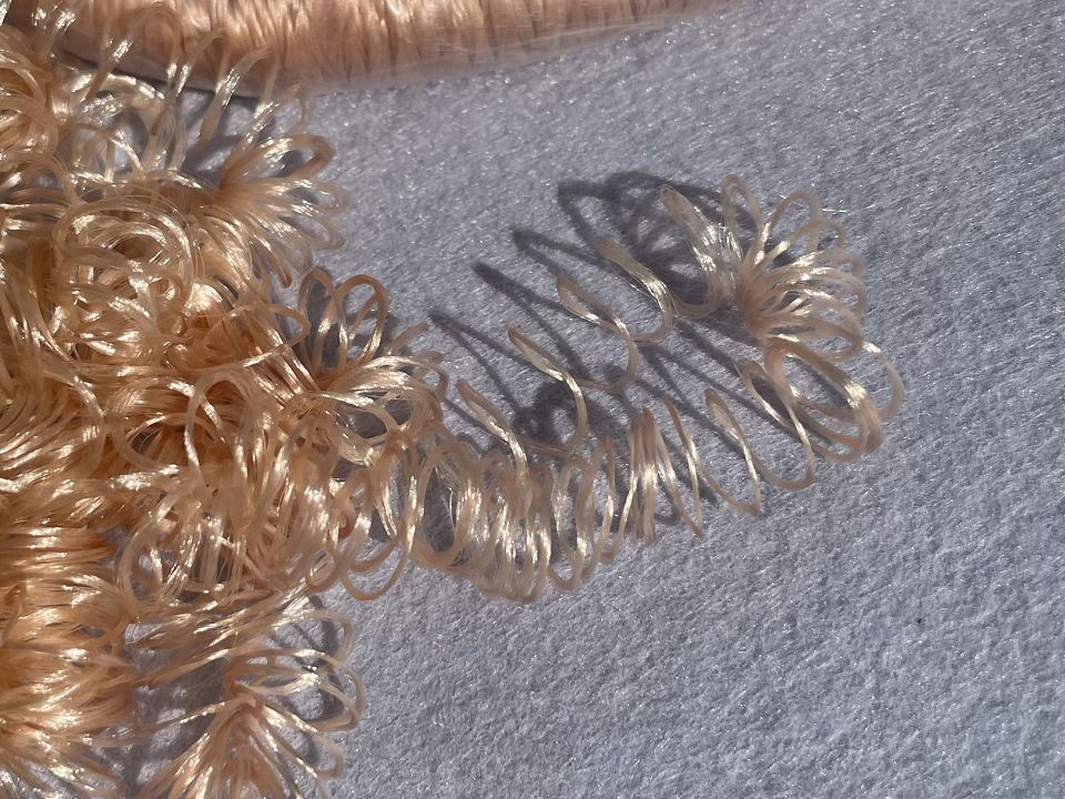 Синтетичні волосся для ляльок в джгуті, в поліетиленовій упаковці. Діаметр 1,5-2 см. Вага: 250г +/- 10 г Волосся кучеряве в стрічці. Потрібно лише відрізати від стрічки пасмо потрібної довжини. Потім пришити або приклеїти пасма, починаючи з потиличної частини голови, розташовуючи їх рядами знизу вгору. Відмінно підійдуть для текстильних ляльок.