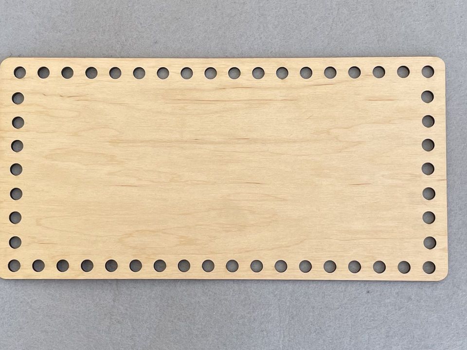 Денце для сумок. Виготовлено з відшліфованою світлої фанери товщиною 4 мм, має прямокутну форму розміром 15 * 30 см. Його використання зробить ваше більш стійкою, при цьому істотно скоротивши витрати пряжі. Також підходить для виробів зі шкіри.