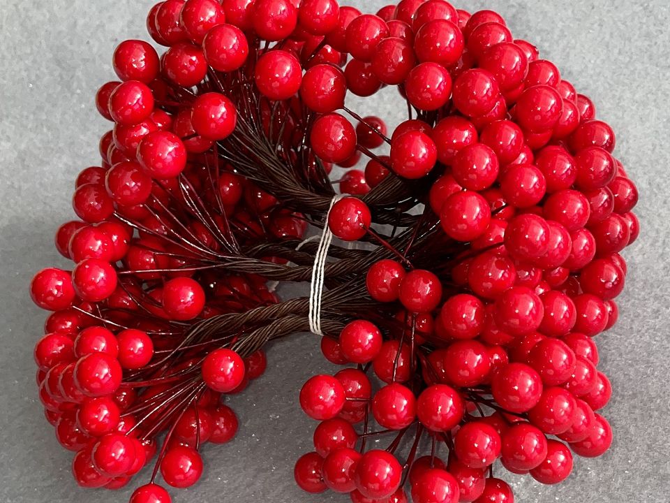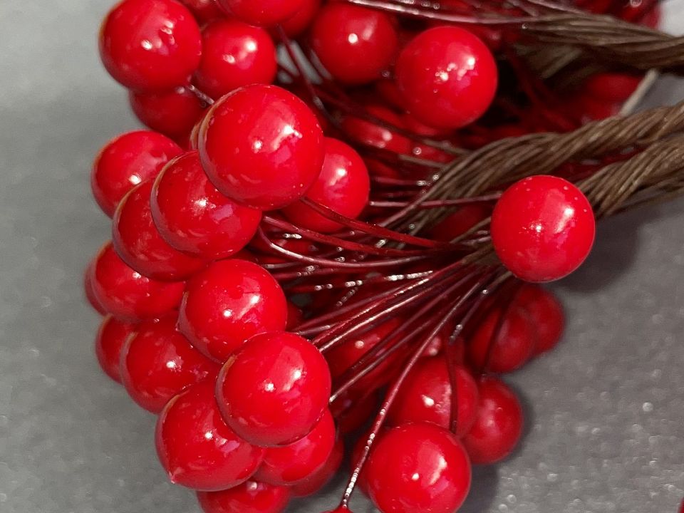 Довжина дроту 12 см, діаметр ягідки 10 мм. Довжина гілочки з ягідками 14см. У наборі 200 дротів, на кожній по 2 ягідки, всього 400 ягідок.