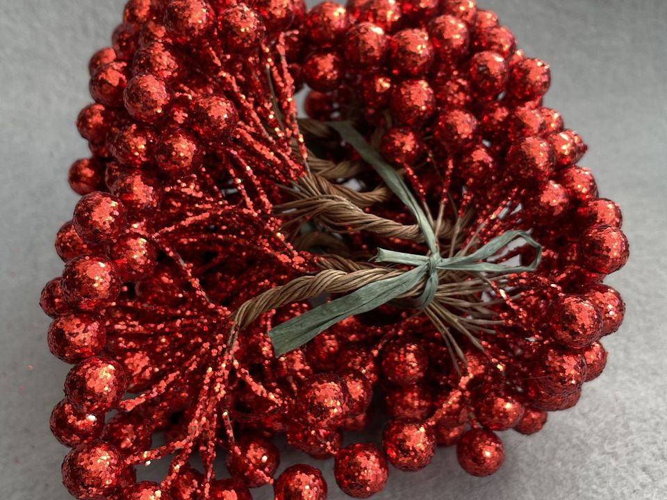 Довжина дроту 12 см, діаметр ягідки 12 мм. Довжина гілочки з ягідками 15см. У наборі 200 дротів, на кожній по 2 ягідки, всього 400 ягідок.