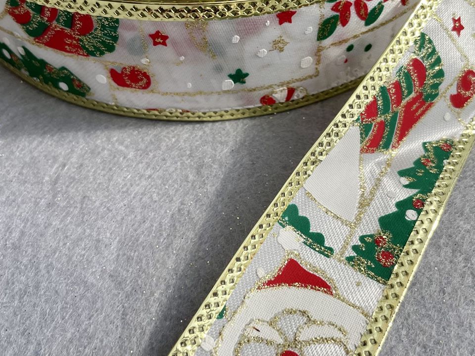 Декоративна новорічна стрічка з дротовим краєм -Добре тримає форму. Ширина-3,8см; в Бабині-45метров. Використовується для оформлення подарунків, композицій, виготовлення ялинкових іграшок та декору, при виготовленні новорічних бантів на ялинку, новорічного декору.