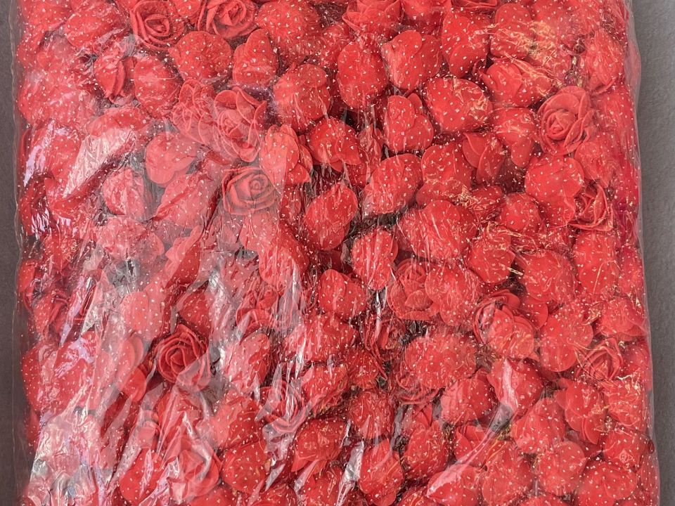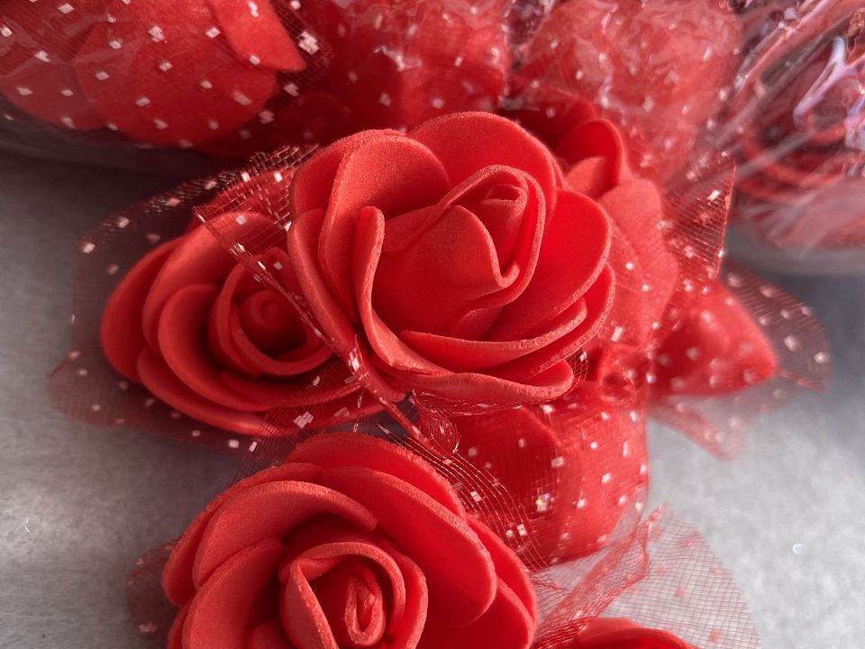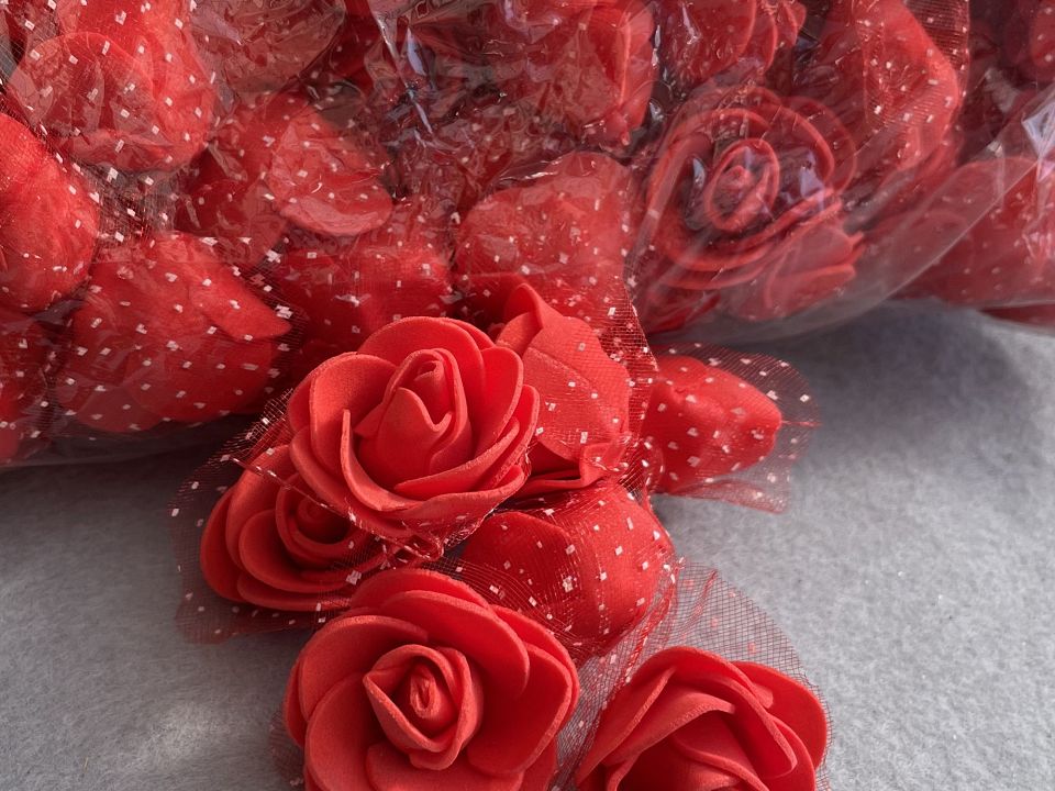 Троянди з фоамірана з фатином Ø3,5-4см. прикрашені Упаковка: 500 шт. Квіти з фоамірана легко розправляються за допомогою пари або фена. Розмір упаковки: 30 * 30см. Колір червоний