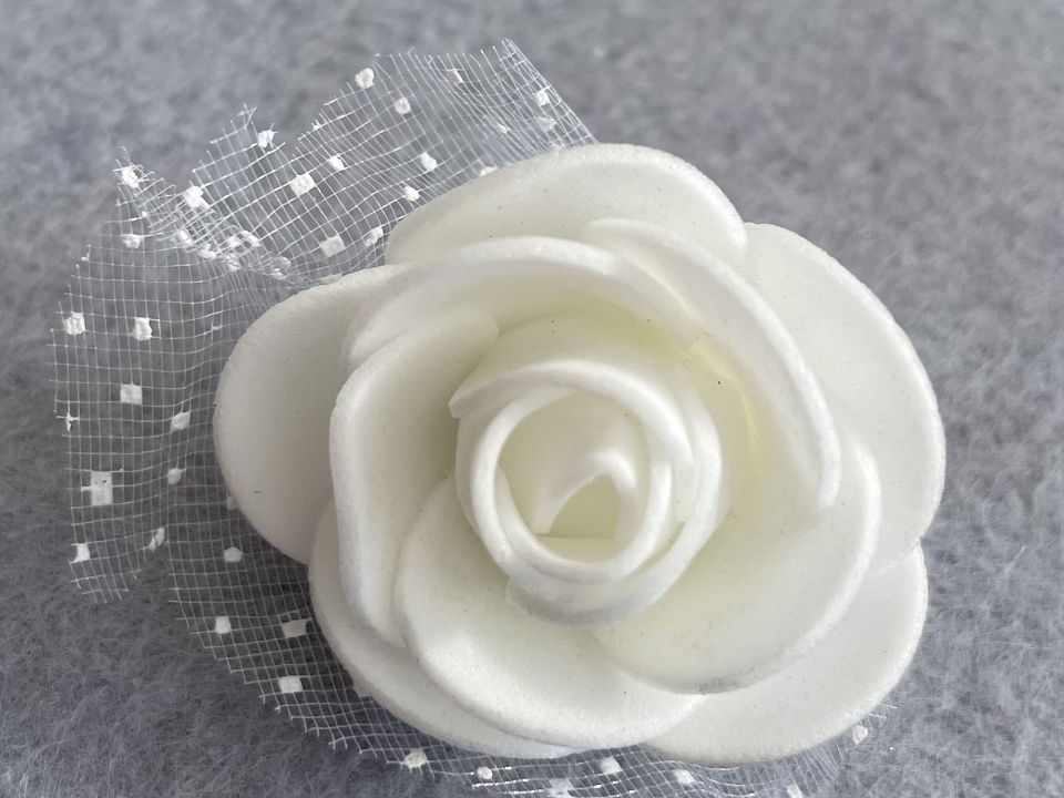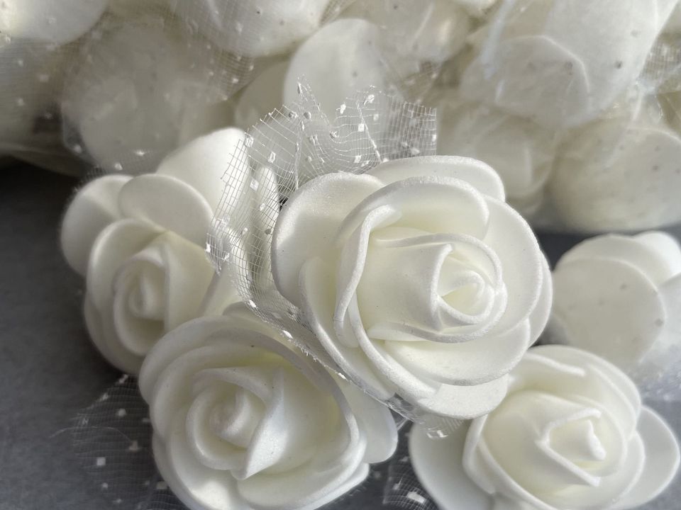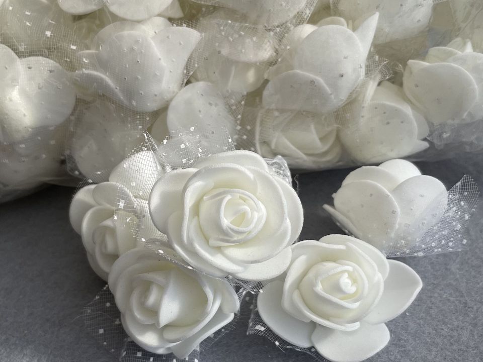 Троянди з фоамірана з фатином Ø3,5-4см. прикрашені Упаковка: 500 шт. Квіти з фоамірана легко розправляються за допомогою пари або фена. Розмір упаковки: 30 * 30см. Колір білий