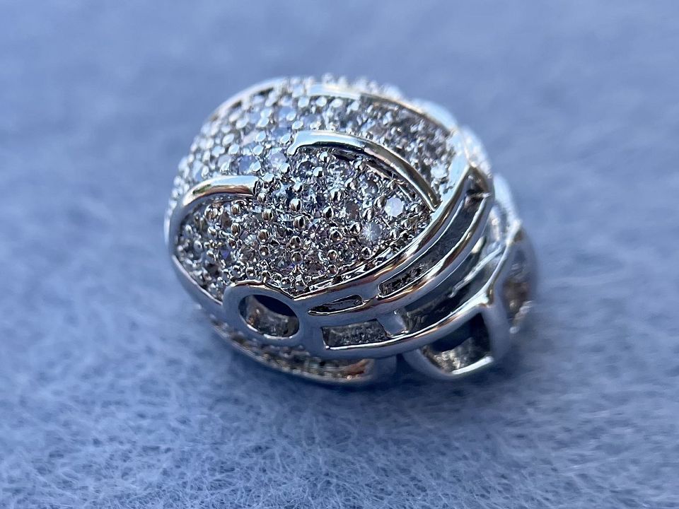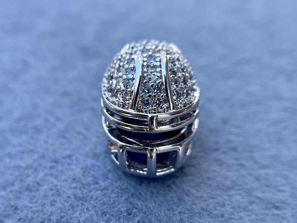 Бусина інкрустована Кубічним цирконієм (також називаються намистинами з фіанітами). Покриття родій Колір-сталь. Розмір: 1*1,5см, отвір: 2мм. Ціна за 1 шт
