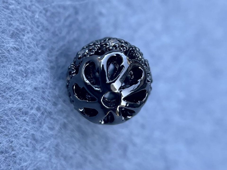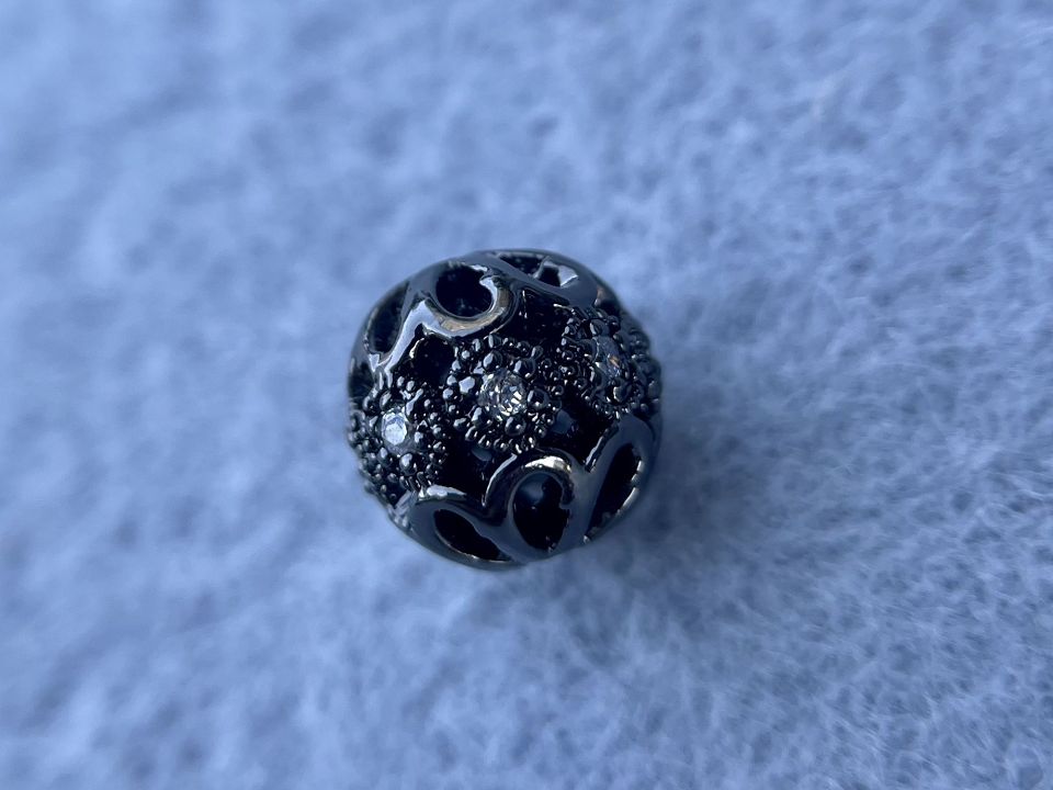Бусина інкрустована Кубічним цирконієм (також називаються намистинами з фіанітами). Покриття родій Колір-чорний. Діаметр: 8мм, отвір: 1,5мм. Ціна за 1 шт
