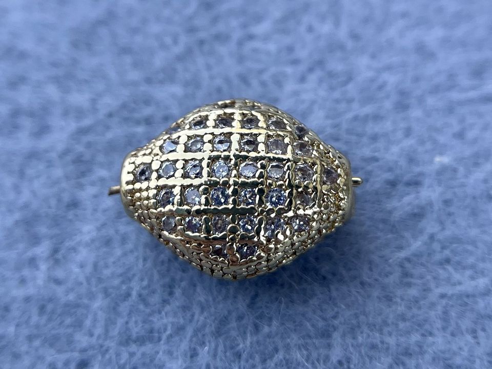 Бусина інкрустована Кубічним цирконієм (також називаються намистинами з фіанітами) Покриття родій Колір-золото. Розмір: 9*11мм; товщина-4мм, отвір-1,5мм. Ціна за 1шт