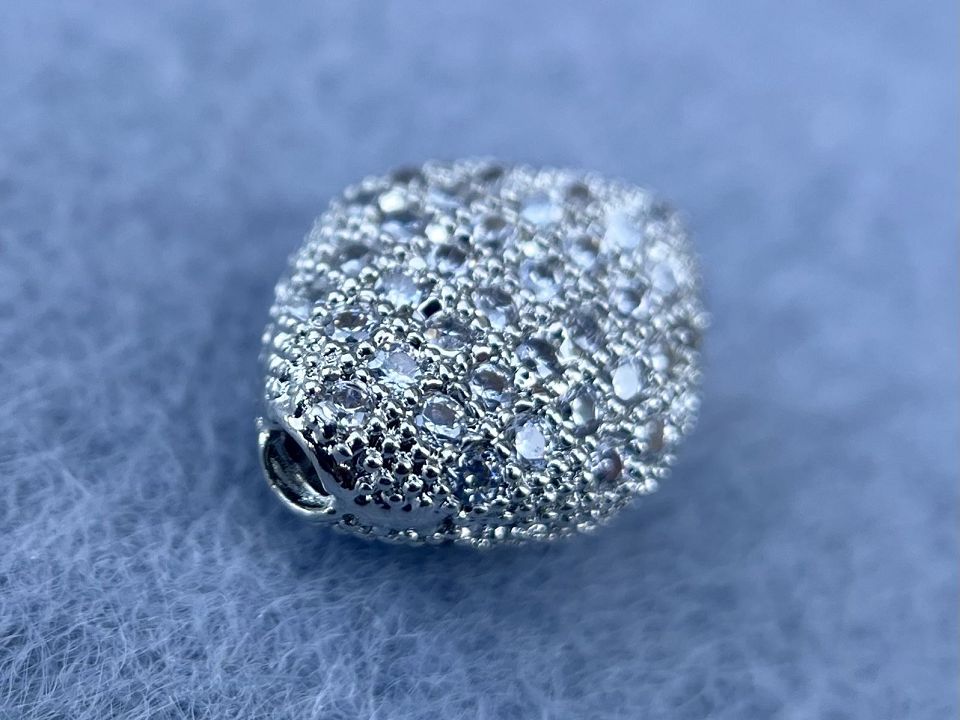 Бусина інкрустована Кубічним цирконієм (також називаються намистинами з фіанітами) Покриття родій Колір-сталь. Розмір: 9*11мм; товщина-4мм, отвір-1,5мм. Ціна за 1шт