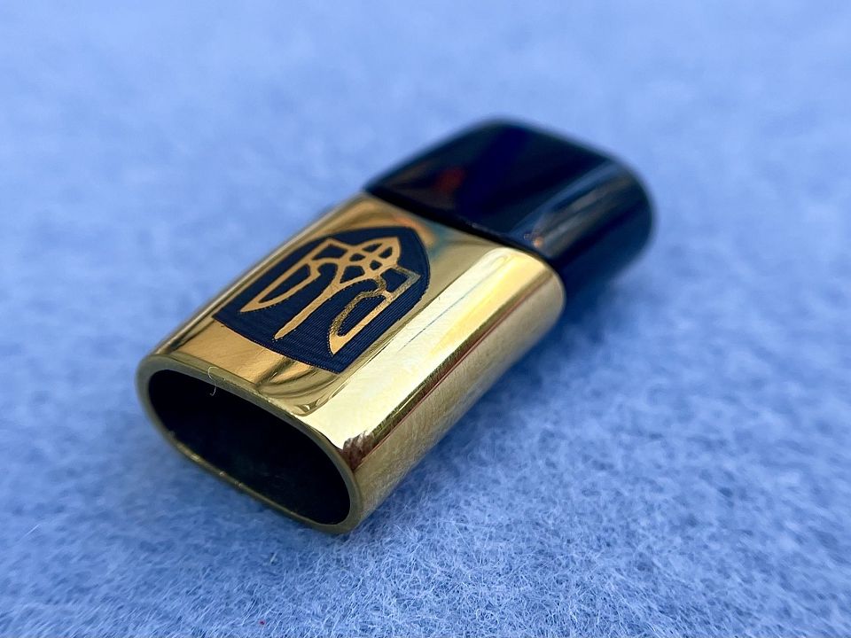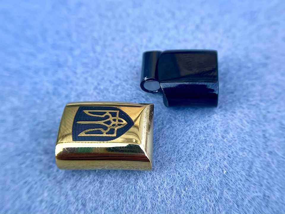 Замок магнітний з гравіюванням із нержавіючої сталі. Відмінно підходить для шкіряних браслетів. Колір золото з чорним. Розмір: 3см*1,4см, розмір отвору-0,65*1,2см. Ціна за 1шт