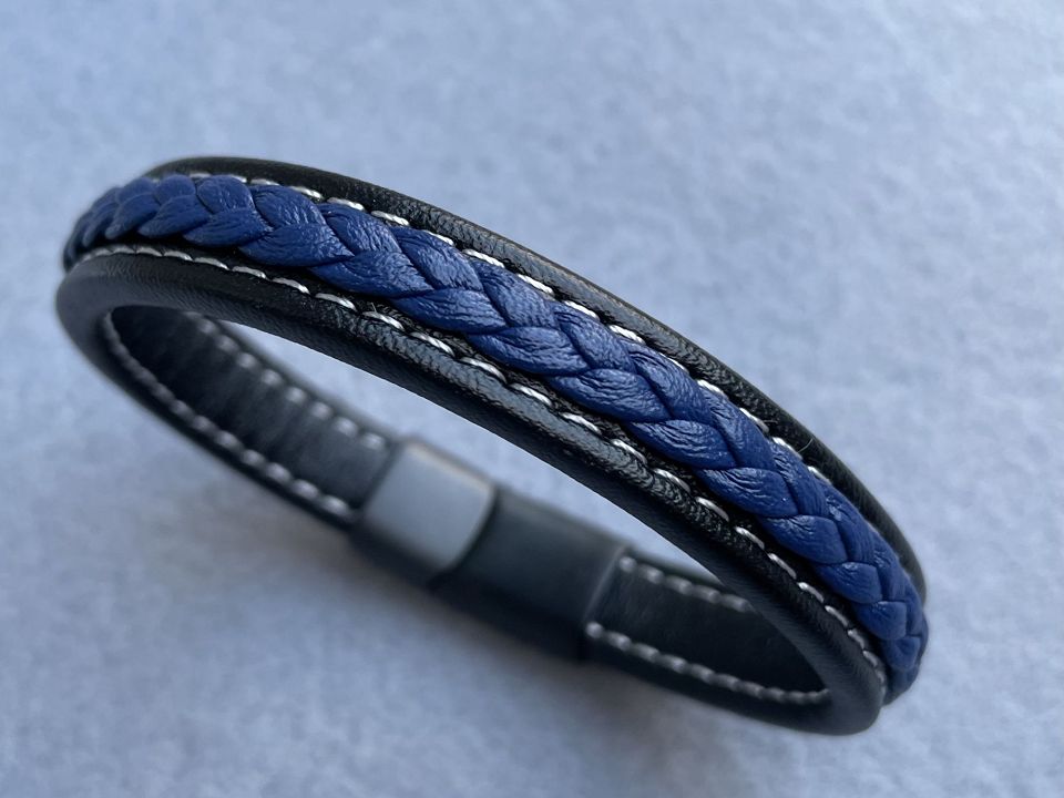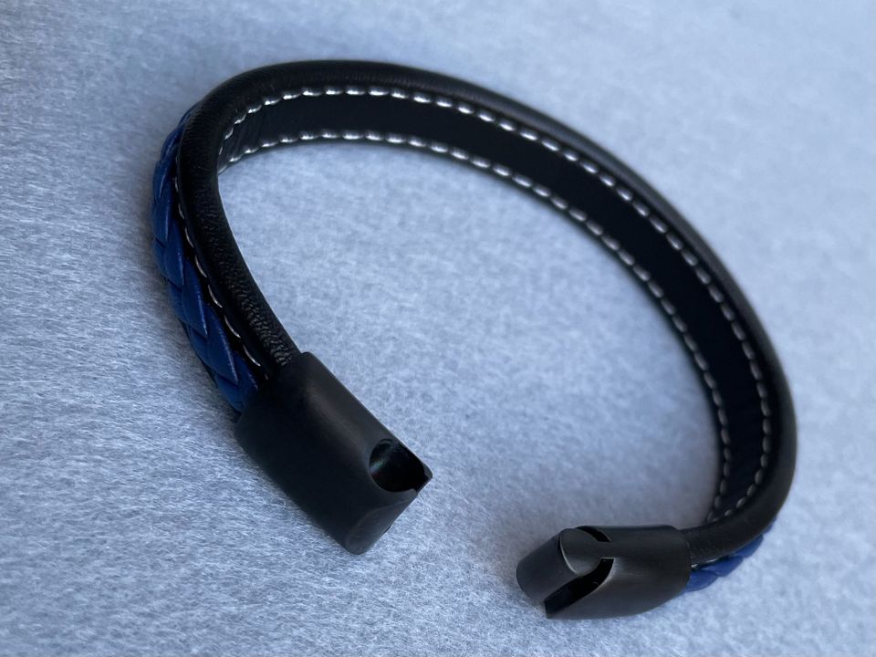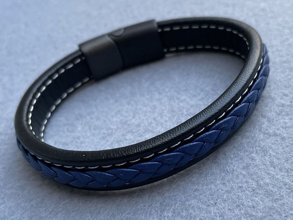 Плетений шкіряний браслет з чорною застібкою з нержавіючої сталі та декоративними фрагментами. Розмір: 21см, ідеально підійде на зап'ястя від 17-20,5см.