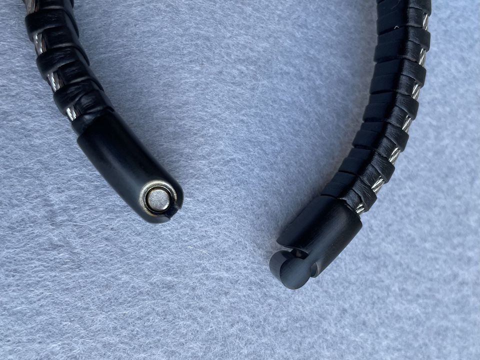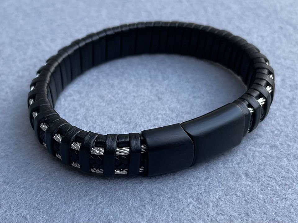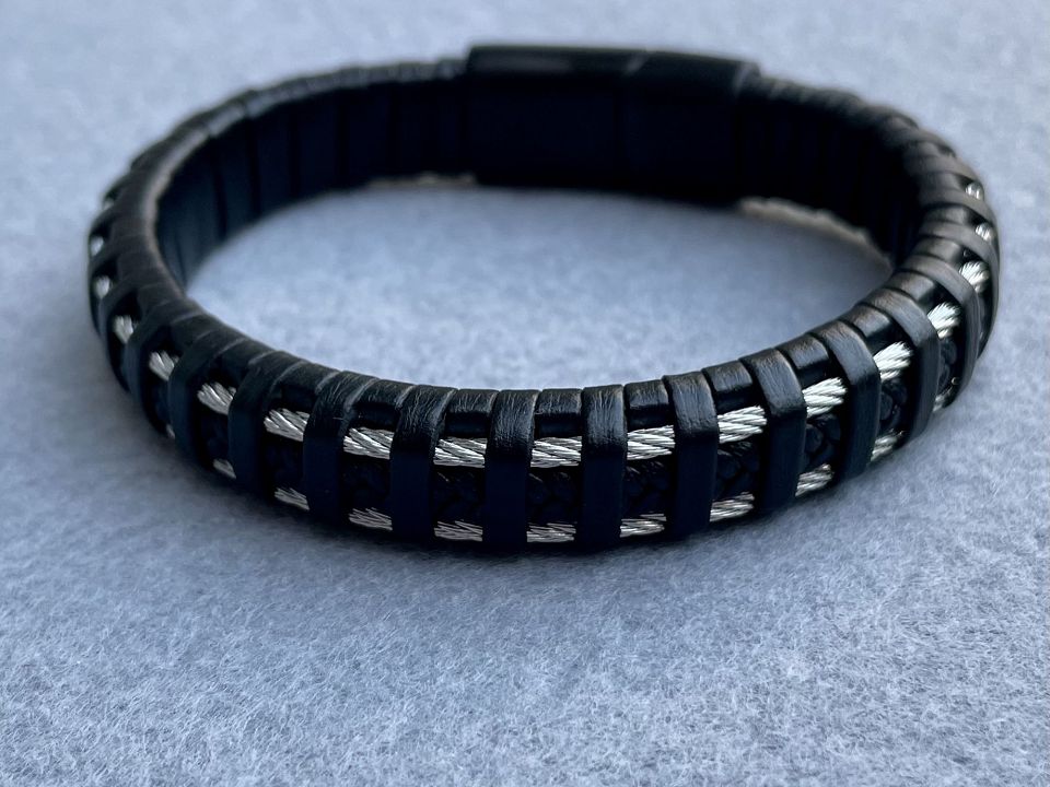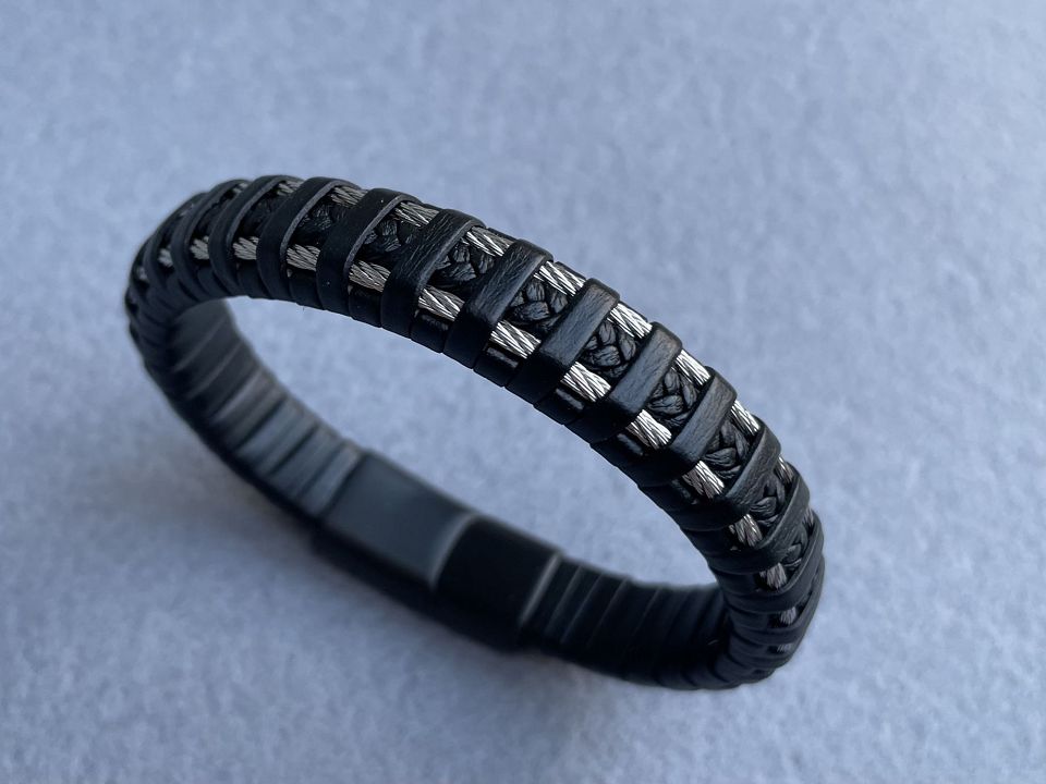 Плетений шкіряний браслет з чорною застібкою з нержавіючої сталі та декоративними вставками. Розмір: 21,5см, ідеально підійде на зап'ястя від 16-20см.