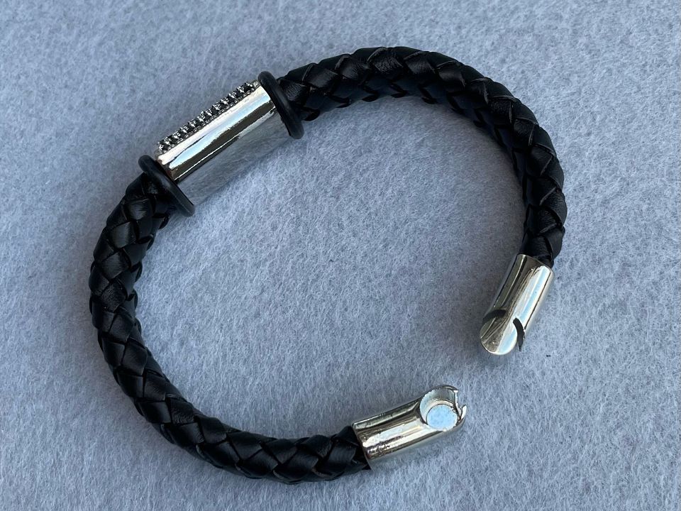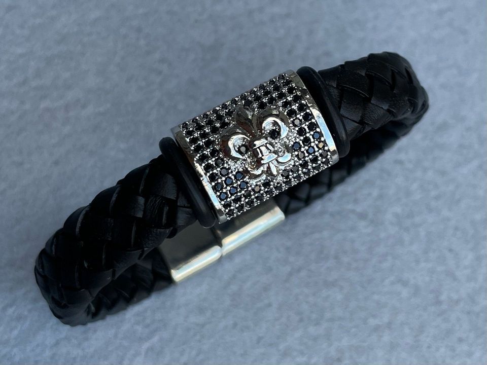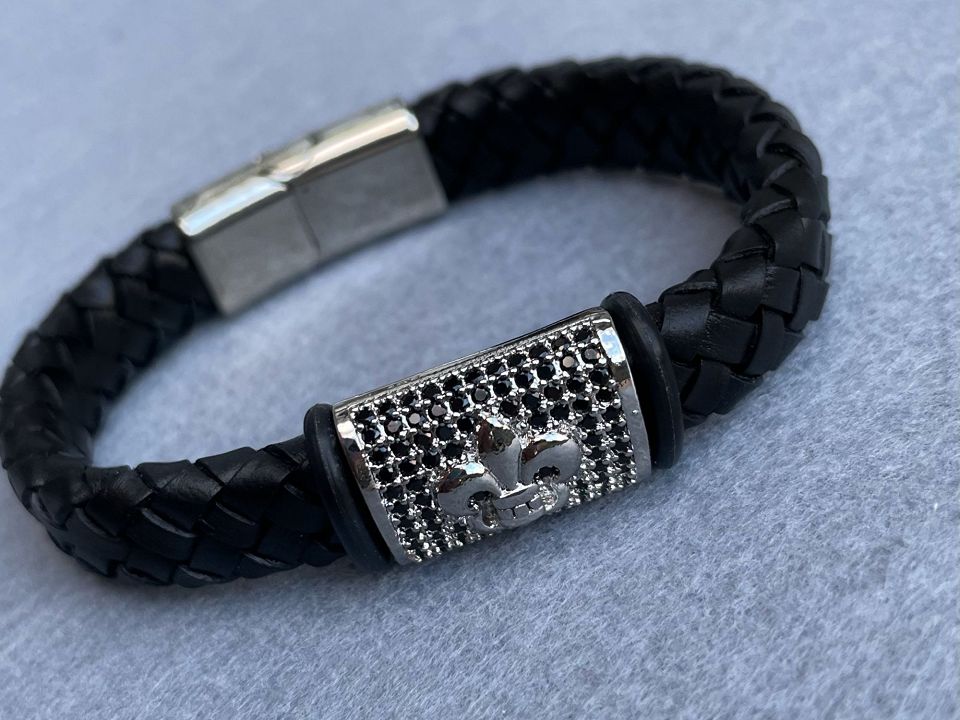 Плетений шкіряний браслет зі сталевою застібкою з нержавіючої сталі та декоративним елементом. Розмір: 20,5см, ідеально підійде на зап'ястя від 16-18см.